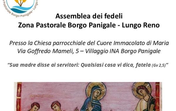 In evidenza News, Parrocchia dei Santi Giovanni Battista e Gemma Galgani, Parrocchia del Cuore Immacolato di Maria, Parrocchia di Nostra Signora della Pace, Parrocchia di S. Maria Assunta di Borgo Panigale, Parrocchia di S. Maria del Carmine di Rigosa, Parrocchia di S. Pio X, Senza categoria, Zona Pastorale Domenica 16 novembre 2025, ore 15:30 ASSEMBLEA DELLE PARROCCHIE DELLA ZONA PASTORALE BORGO PANIGALE – LUNGO RENO Chiesa parrocchiale del Cuore Immacolati di Maria (C.I.M.) Tutte le notizie Appuntamenti 26Gennaio ore 16:00 Zona Pastorale 26 gennaio 2025 – Domenica della Parola 31Maggio ore 18:00 Parrocchia di S. Maria Assunta di Borgo Panigale, Zona Pastorale 31 maggio 2024 – Giubileo della nostra Casa della Carità 2Giugno ore 18:00 Parrocchia di S. Maria Assunta di Borgo Panigale 02 giugno 2024 – Festa parrocchiale Santa Maria Assunta 1Giugno ore 16:30 Parrocchia di S. Maria Assunta di Borgo Panigale 01 giugno 2024 – Festa parrocchiale Santa Maria Assunta Tutti gli Appuntamenti Aggiungi alla App calendario Le parrocchie della Zona Pastorale Santi Giovanni Battista e Gemma Galgani S. Pio X Nostra Signora della Pace Cuore Immacolato di Maria S. Maria del Carmine di Rigosa S. Maria Assunta di Borgo Panigale Le ultime notizie della Zona Pastorale Domenica 16 novembre 2025, ore 15:30 ASSEMBLEA DELLE PARROCCHIE DELLA ZONA PASTORALE BORGO PANIGALE – LUNGO RENO Chiesa parrocchiale del Cuore Immacolati di Maria (C.I.M.) Riflessione sul bravo evangelico delle nozze di Cana guidata da don Stefano Culiersi. A seguire, divisione e confronto in… > 24 Ottobre 2025 ESTATE RAGAZZI FestaInsieme ER 2025https://www.youtube.com/watch?v=mnIKT_jPhg8… > 22 Giugno 2025 07/06/2025 | Veglia di Pentecoste Veglia di Pentecoste Sabato 7 giugno 2025 ORE 19 ritrovo sul sagrato della propria parrocchia …poi camminando insieme nella preghiera… > 19 Maggio 2025 Feste parrocchiali 2025 Occasioni per la nostra zona pastorale per ritrovarsi, condividere momenti di gioia e celebrare insieme Le feste parrocchiali son un’occasioni per la nostra zona pastorale per ritrovarsi, condividere momenti di gioia e celebrare insieme. Casteldebole… > 12 Maggio 2025 LEONE XIV Annuntio vobis gaudium magnum; habemus Papam: Eminentissimum ac Reverendissimum Dominum, Dominum Robertum Franciscum Sanctae Romanae Ecclesiae Cardinalem Prevost qui sibi nomen imposuit LEONEM XIV PREVOST Card. Robert Francis, O.S.A. Il Cardinale Robert Francis Prevost, O.S.A., Prefetto del Dicastero per i Vescovi, Arcivescovo-Vescovo emerito di… > 9 Maggio 2025 21 aprile 2025 (Lunedì dell’Angelo) | Papa Francesco è tornato alla casa del Padre 21 Aprile 2025 Stazioni Quaresimali 2025 Stazioni Quaresimali 2025… > 17 Marzo 2025 domenica 26 gennaio 2025 sarà la Domenica della Parola Domenica della Parola 2025 13 Gennaio 2025 Casa della Carità di Borgo Panigale 31 maggio 2024 – Giubileo della nostra Casa della Carità venerdì 31 maggio 2024 Santa Messa ore 18:00 in giardino 27 Maggio 2024 Sta iniziando il periodo delle feste parrocchiali Feste parrocchiali nella Zona Pastorale Nostra Signora della Pace… > 19 Maggio 2024 Tutte le notizie della Zona Pastorale I nostri canali e link