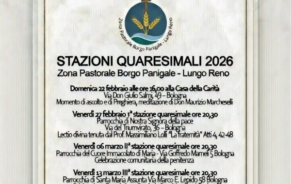 In evidenza News, Parrocchia di Nostra Signora della Pace, Parrocchia di S. Pio X, Senza categoria, Zona Pastorale presieduta dal nostro Arcivescovo Matteo Zuppi Veglia per la pace Chiesa di Nostra Signora della Pace - via del Triunvirato 36/3, Bologna News, Parrocchia del Cuore Immacolato di Maria, Zona Pastorale domenica 25 gennaio 2026 sarà la Domenica della Parola Domenica della Parola 2026 Tutte le notizie Appuntamenti 18Gennaio ore 21:00 Parrocchia di Nostra Signora della Pace, Parrocchia di S. Pio X, Zona Pastorale Veglia per pace 25Gennaio ore 16:00 Zona Pastorale 25 gennaio 2026 – Domenica della Parola 26Gennaio ore 16:00 Zona Pastorale 26 gennaio 2025 – Domenica della Parola 31Maggio ore 18:00 Parrocchia di S. Maria Assunta di Borgo Panigale, Zona Pastorale 31 maggio 2024 – Giubileo della nostra Casa della Carità Tutti gli Appuntamenti Aggiungi alla App calendario Le parrocchie della Zona Pastorale Santi Giovanni Battista e Gemma Galgani S. Pio X Nostra Signora della Pace Cuore Immacolato di Maria S. Maria del Carmine di Rigosa S. Maria Assunta di Borgo Panigale Le ultime notizie della Zona Pastorale presieduta dal nostro Arcivescovo Matteo Zuppi Veglia per la pace Chiesa di Nostra Signora della Pace - via del Triunvirato 36/3, Bologna 10 Gennaio 2026 domenica 25 gennaio 2026 sarà la Domenica della Parola Domenica della Parola 2026 Chiesa del Cuore Immacolato di Maria (C.I.M.) - via Mameli 5, Bologna 10 Gennaio 2026 Domenica 16 novembre 2025, ore 15:30 ASSEMBLEA DELLE PARROCCHIE DELLA ZONA PASTORALE BORGO PANIGALE – LUNGO RENO Chiesa parrocchiale del Cuore Immacolati di Maria (C.I.M.) Riflessione sul bravo evangelico delle nozze di Cana guidata da don Stefano Culiersi. A seguire, divisione e confronto in… > 24 Ottobre 2025 ESTATE RAGAZZI FestaInsieme ER 2025https://www.youtube.com/watch?v=mnIKT_jPhg8… > 22 Giugno 2025 07/06/2025 | Veglia di Pentecoste Veglia di Pentecoste Sabato 7 giugno 2025 ORE 19 ritrovo sul sagrato della propria parrocchia …poi camminando insieme nella preghiera… > 19 Maggio 2025 Feste parrocchiali 2025 Occasioni per la nostra zona pastorale per ritrovarsi, condividere momenti di gioia e celebrare insieme Le feste parrocchiali son un’occasioni per la nostra zona pastorale per ritrovarsi, condividere momenti di gioia e celebrare insieme. Casteldebole… > 12 Maggio 2025 LEONE XIV Annuntio vobis gaudium magnum; habemus Papam: Eminentissimum ac Reverendissimum Dominum, Dominum Robertum Franciscum Sanctae Romanae Ecclesiae Cardinalem Prevost qui sibi nomen imposuit LEONEM XIV PREVOST Card. Robert Francis, O.S.A. Il Cardinale Robert Francis Prevost, O.S.A., Prefetto del Dicastero per i Vescovi, Arcivescovo-Vescovo emerito di… > 9 Maggio 2025 21 aprile 2025 (Lunedì dell’Angelo) | Papa Francesco è tornato alla casa del Padre 21 Aprile 2025 Stazioni Quaresimali 2025 Stazioni Quaresimali 2025… > 17 Marzo 2025 domenica 26 gennaio 2025 sarà la Domenica della Parola Domenica della Parola 2025 13 Gennaio 2025 Tutte le notizie della Zona Pastorale I nostri canali e link