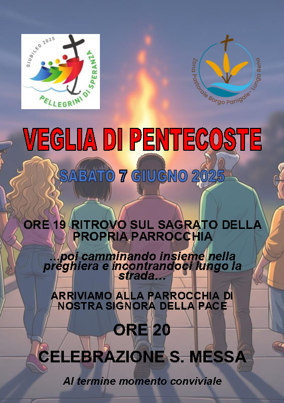 Veglia di Pentecoste Sabato 7 giugno 2025 ORE 19 ritrovo sul sagrato della propria parrocchia …poi camminando insieme nella preghiera e incontrandoci lungo la strada… ARRIVIAMO ALLA PARROCCHIA DI NOSTRA SIGNORA DELLA PACE Ore 20:00 celebrazione S. Messa Al termine momento conviviale